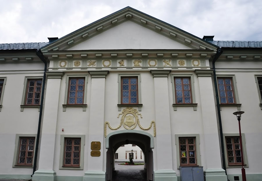 Далее мы видим дворец Хрептовича (родовое имение последнего канцлера ВКЛ). Здание основано в конце 18 века. Красивый фасад украшен расписными рыцарскими гербами.